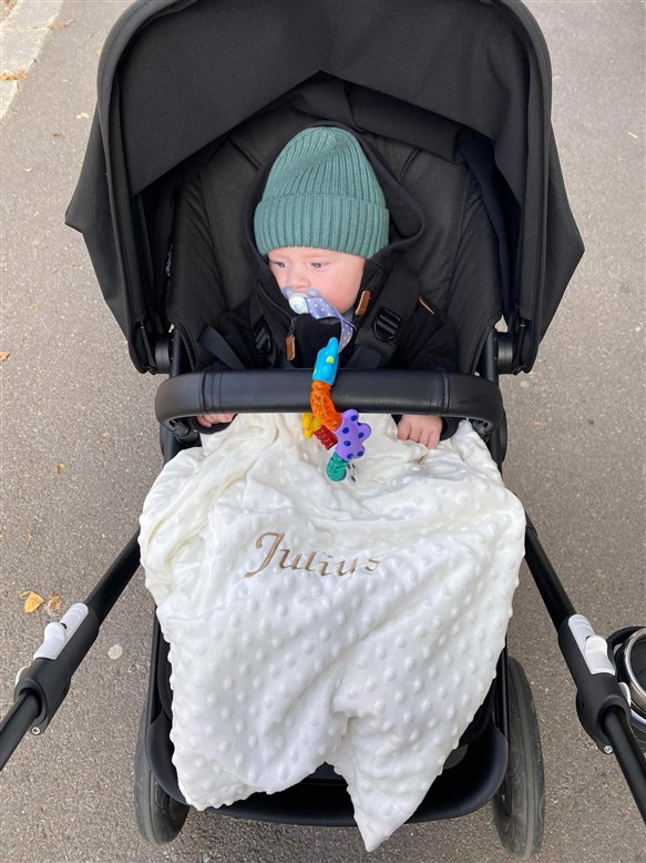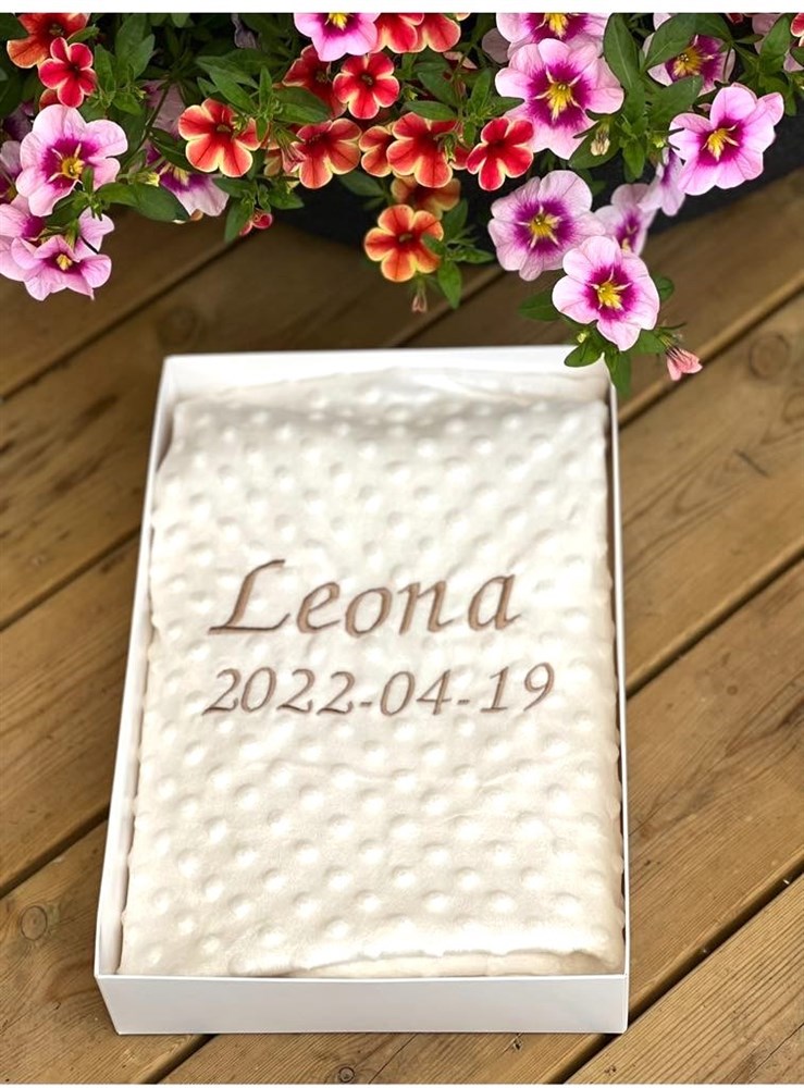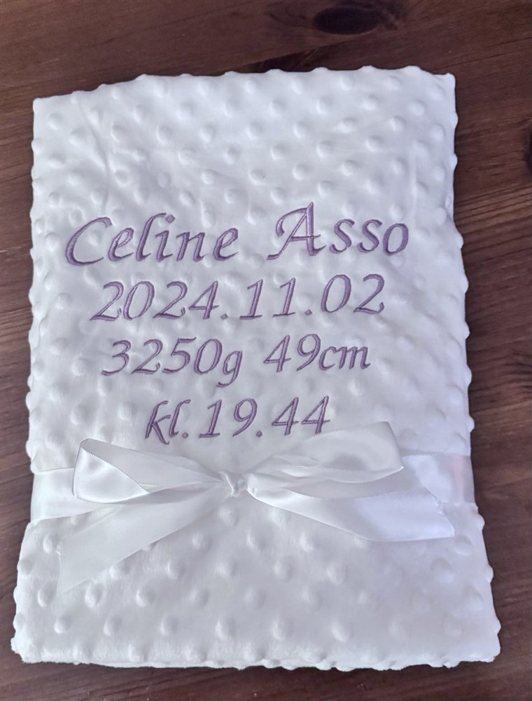 Filt med två  namn, datum vikt och längd och tid