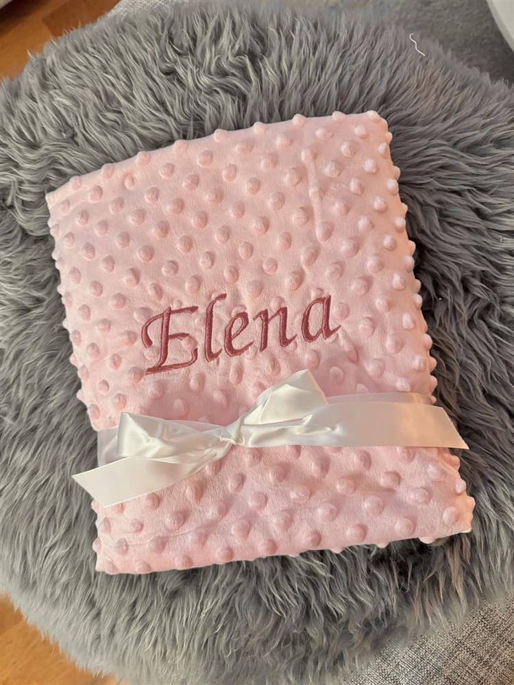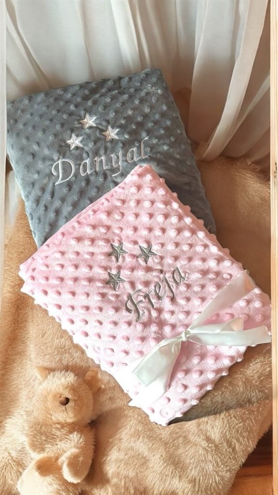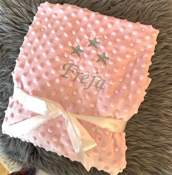 Bubbelfilt rosa här  broderad  med stjärnor och ett namn i ljusgrått